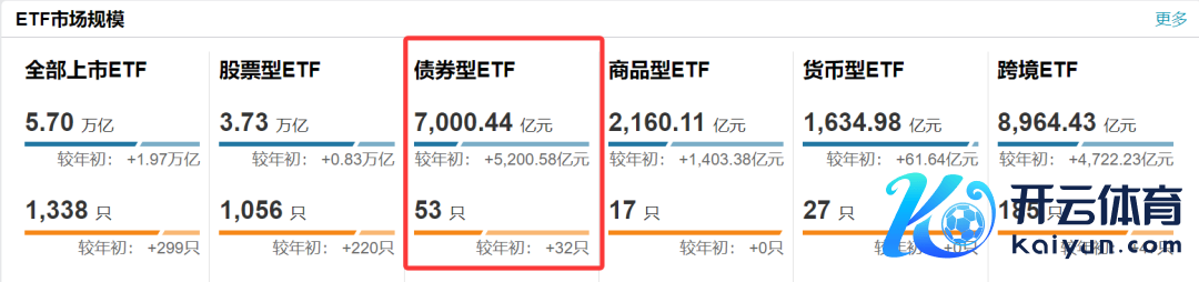 Wind数据袒露,截止11月3日债券ETF总畛域冲突7000亿元,为7000.44亿元,是这一品种继9月下旬后畛域再次增多千亿元。数据袒露,9月22日前后,债券ETF畛域冲突6000亿元大关。早在7月时债券ETF畛域接连冲突4000亿元和5000亿元,6月冲突3000亿元,2月冲突2000亿元。即说,2025年以来债券ETF畛域已接连冲突六个“千亿”关隘。