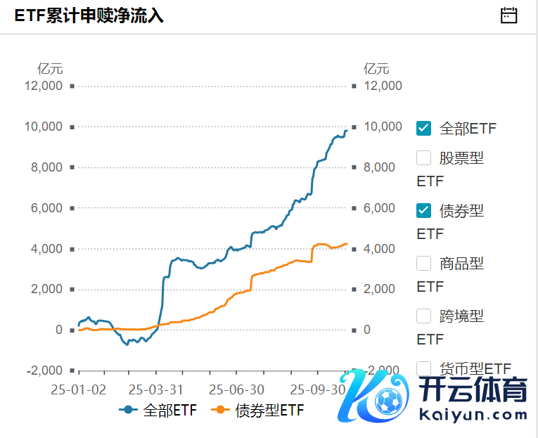 一是债券ETF现时的7000多亿畛域,有逾70%是2025年收场的增量畛域;现时的53只居品中有32仅仅年内新建立的居品,占比逾越60%。二是全商场ETF年内累计申购净流入9800亿元掌握,其中有4232.51亿元来自债券ETF。