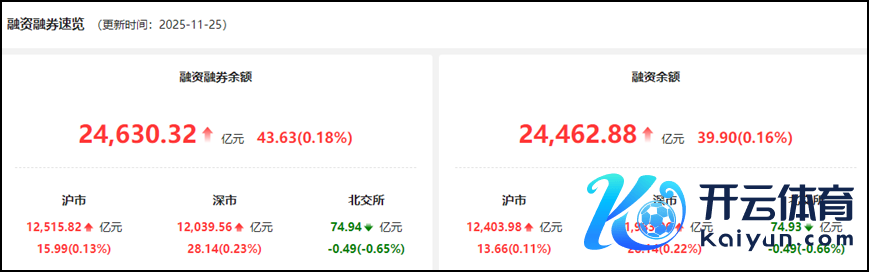 上证报中国证券网讯(卢伊记者徐蔚)11月25日,A股两融余额为24630.32亿元,较上一来已往加多43.63亿元,占A股设备市值比例为2.59%。当日两融来往额为1879.83亿元,较上一来已往加多230.65亿元,占A股成交额的10.29%。