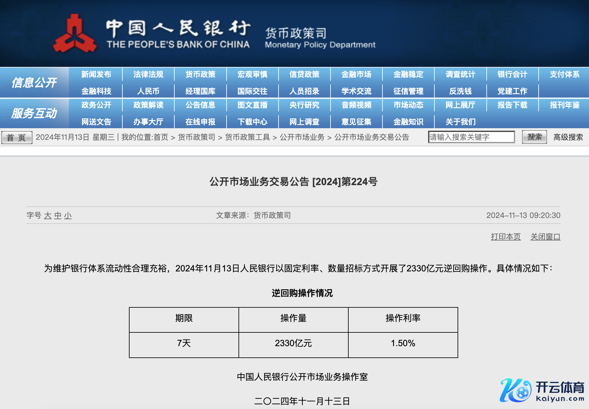 11月13日金融一线音讯,据央行网站音讯,为爱戴银行体系流动性合理充裕,2024年11月13日东说念主民银行以固定利率、数目招标阵势开展了2330亿元7天期逆回购操作。操作利率1.50%,与此前握平。