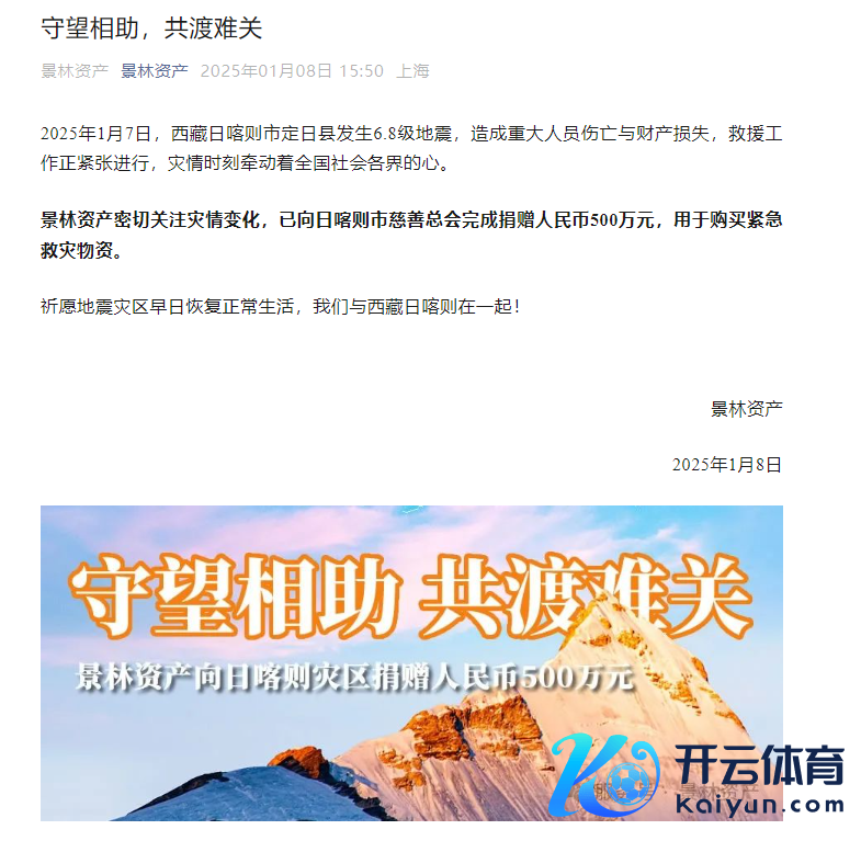 此外,百亿私募上海景林资产1月8日下昼通过微信公众号发布音问称,景林资产密切关心灾情变化,已向日喀则市慈善总会完成捐赠东说念主民币500万元,用于购买进攻救灾物质。