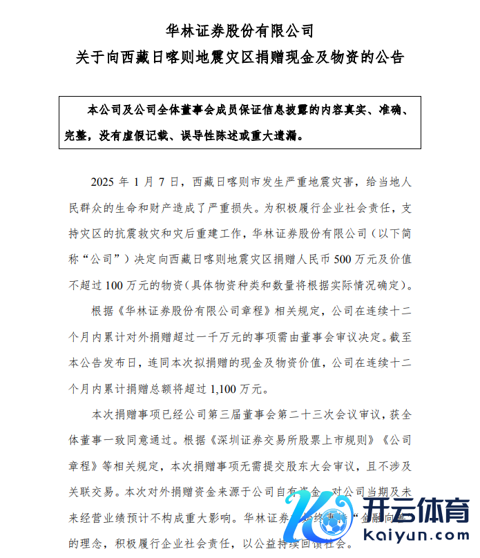 华林证券(002945)(002945.SZ)于1月8日上昼公告,决定向西藏日喀则地震灾地捐赠东说念主民币500万元及价值不跳动100万元的物质。