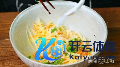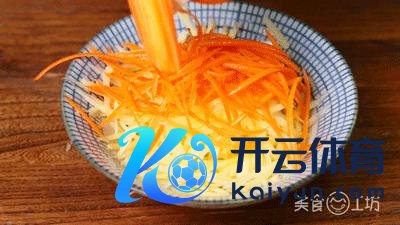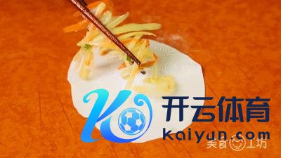 5. 接口处涂抹适量净水来便捷粘合,将土豆胡萝卜丝卷起来。