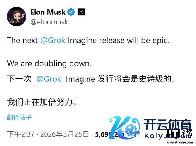 马斯克昨日(3 月 25 日)在 X 平台发布推文,说起 xAI 的视频创作居品 Grok Imagine,强调下一版发布将是“史诗级的”,并明确暗示公司正在“加倍参加”。