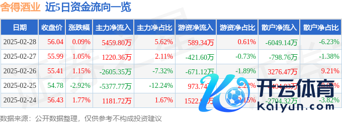 本站音信,放胆2025年2月28日收盘,舍得酒业(600702)报收于56.04元,高涨0.09%,换手率5.1%,成交量16.96万手,成交额9.71亿元。