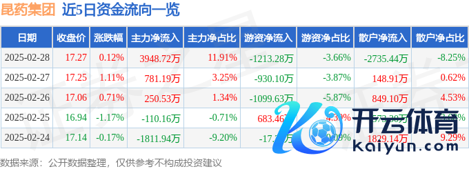本站音讯,扫尾2025年2月28日收盘,昆药集团(600422)报收于17.27元,高涨0.12%,换手率2.52%,成交量19.06万手云开体育,成交额3.31亿元。