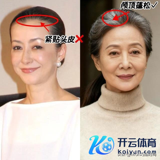 你看底下的对比,左边这种相比紧的扎发会导致头顶贴着头皮,脸型再齐备的女东谈主也很难独霸,右边这种高颅顶、带有蓬松感的扎发才符合大部分的中年女东谈主,只不外颅顶也不是越高越好,留2-3cm的高度就行了。