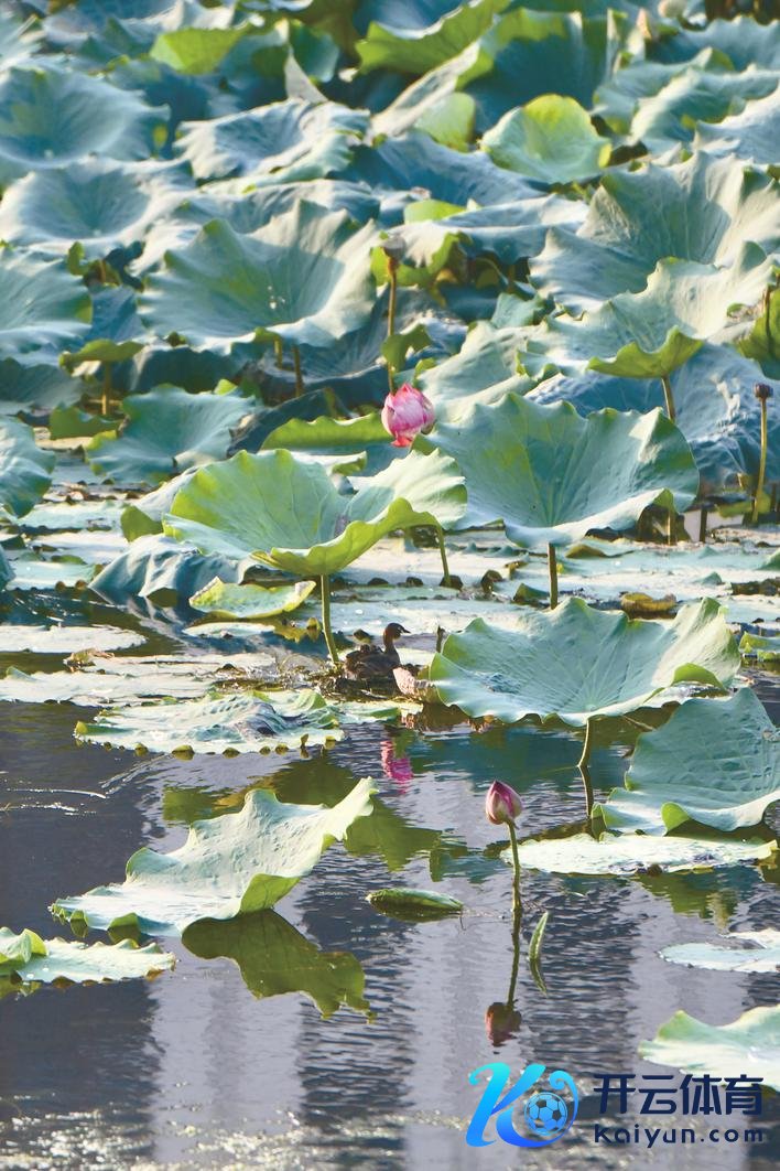 近日云开体育,秀洲公园水池内,水禽栖息在硕大的荷叶下,似乎期盼着初秋的阴寒。微风拂过水池,荷花轻轻摇动,这里多了几分恬静与凉爽。■照相 记者 王 蓉