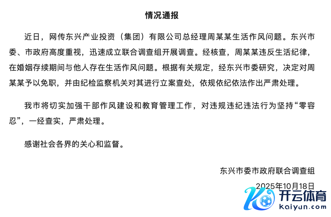近日,网传东兴产业投资(集团)有限公司总司理周某某生涯格调问题。东兴市委、市政府高度爱好,飞速成就聚拢打听组开展打听。经核查,周某某违抗生涯次序,在婚配存续时辰与他东谈主存在生涯格调问题。